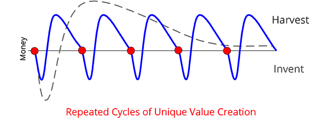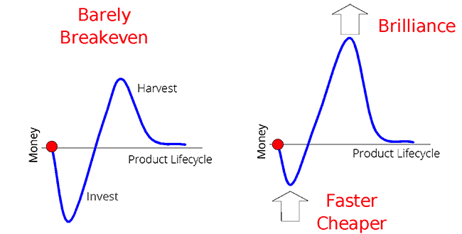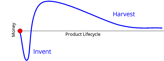 - Invention must be fast and cheap – The downward side of the curve needs to be as small as possible. Driving down the cost and improving the speed of innovation keeps the cost of invention in line with the shorter lifecycle on the harvest side.