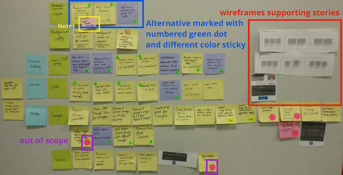 - Tidy up and rearrange stickies frequently before it grows big and becomes very difficult to manage. Keep good walking space near walls. e.g. NFR story map wall photo shown above :-)