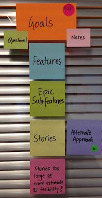 - Use different colors to represent different levels in story map e.g. Orange for Goals, Blue for Features, Green for Epics and Yellow for Stories.