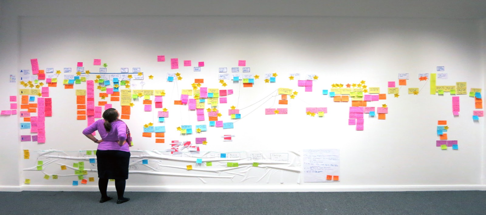 Having conducted research, the team needs to share their research findings with each other in order to make sense of it. Generally this involves a large space and plenty of post-it notes. The data is synthesised with common themes drawn out and opportunities for further research highlighted.