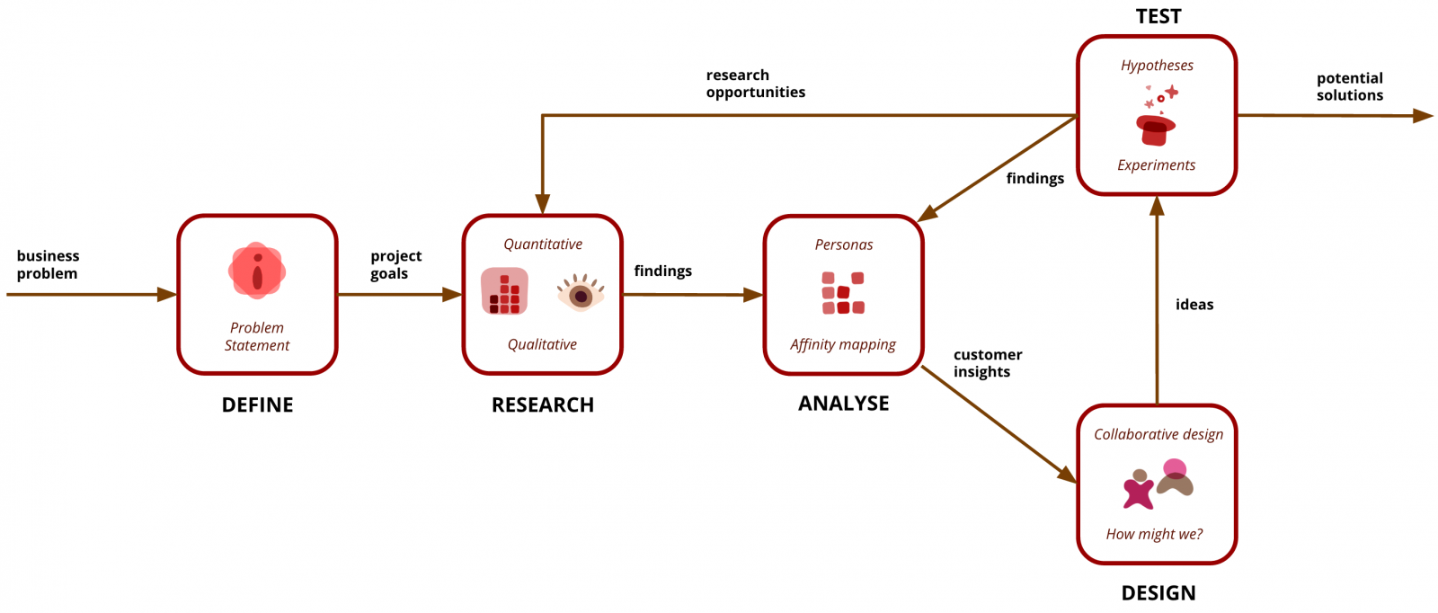 I have called out the set of stages in this process as Define, Research, Analyse, Design and Test, each stage having different activities and outputs. Stages can often run in parallel, as new discoveries feed back into the process; it is very likely that some parts of the team will continue research while experiments are being conducted.