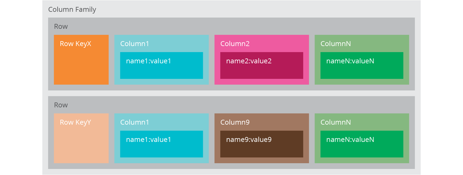 Each column family can be compared to a container of rows in an RDBMS table where the key identifies the row and the row consists of multiple columns. The difference is that various rows do not have to have the same columns, and columns can be added to any row at any time without having to add it to other rows.