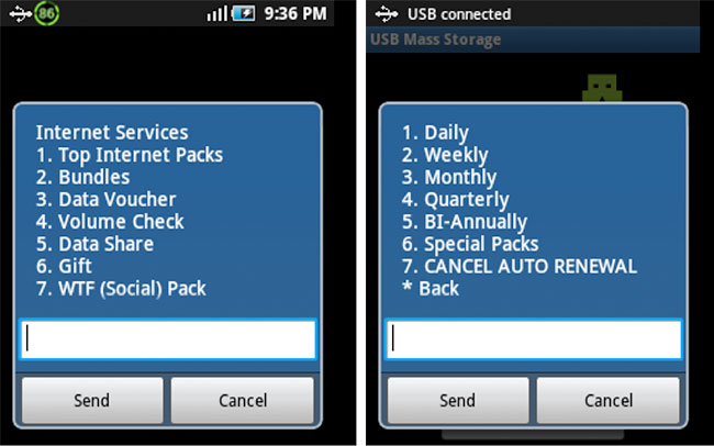 Unstructured Supplementary Service Data is a protocol used by cellular phones to communicate with a service provider. An application built using USSD will have a unique  short code in the form “*123#” or “*142*2#”; usually assigned by a mobile telecommunications company (service provider). The short code is sent using a phone to a server, which sends a menu or a question for a user to respond to - as shown in the pictures below.