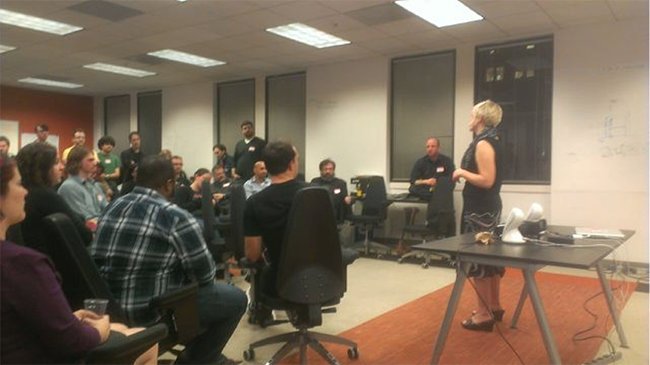 Above: Rainey Reitman talks to a room of EFFers and TWers about what we can do to promote rights online.