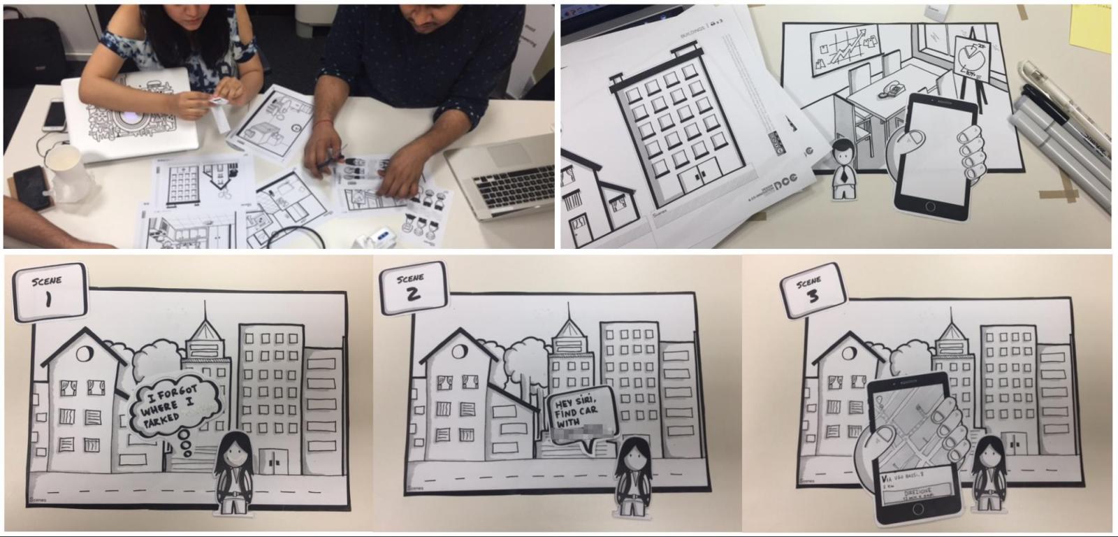 The Scenes Kit by SAP provides printable images of devices, environments and characters that can be arranged into storyboards. Breaking down the user experience into a sequence of scenes forces the team to visualize how users would behave at any given moment, what they would say and think. Reflecting on these micro-moments can really make the difference in crafting the user experience by uncovering opportunities to delight customers that could otherwise be overlooked.