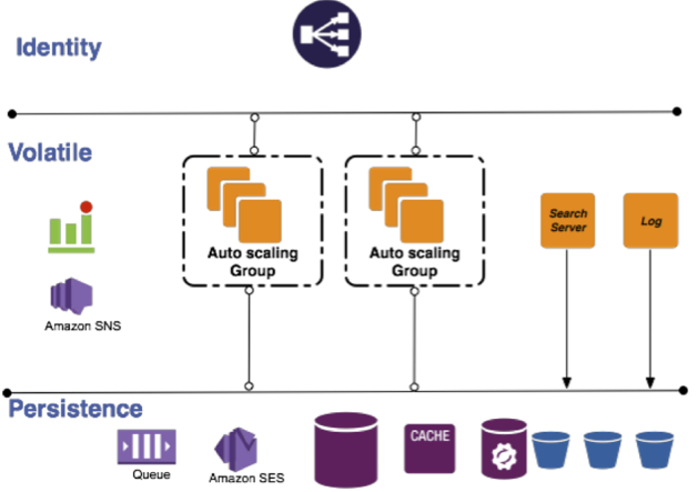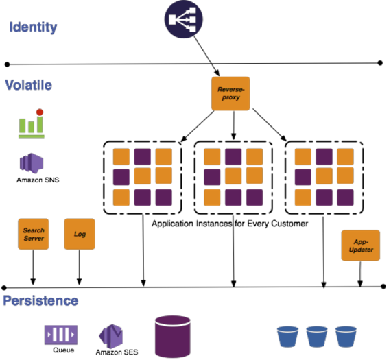 Once we implemented multi-tenancy, we were able to reduce the number of compute instances to two (to ensure redundancy and distribute load) for all the web requests we needed to handle. Having such an architecture allowed us to move the application state to persistence and identity layers, while keeping the volatile resources ignorant to state.