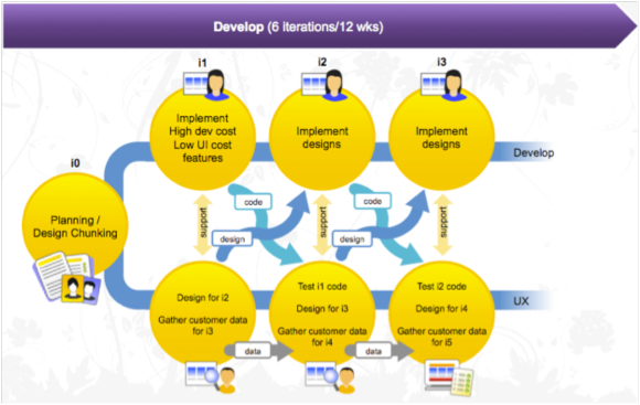 This requires the delivery team made up of a product owner, business analysts, developers, graphic and experience designers, to work closely at all times. It is always wise start iteration zero with non-design focussed work (e.g. setting up development environments) to allow design resources to chunk the work they need to start delivering in iteration one(i1).