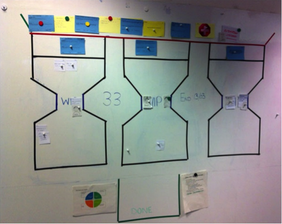 “Hourglass” is our first place winner. We like it for its: 1) practice of identifying the team’s bottleneck; 2) creative and intuitive implementation of WIP limits; 3) clear visualization of what’s in progress and what’s on deck; and 4) simplicity (no clutter on this wall!). Read more about the story behind this wall.