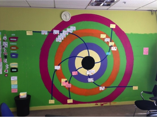 Another runner up is the Vortex wall, which is also fondly known as the “whirlpool” and “tornado” by its team. The brightly colored rings communicate the various stages, which we thought was an inventive spin on the standard column layout. It’s clear which cards are closest to done -- the bullseye -- and who’s working on them. The wall is a great talking point for the team, who enjoy the wall they painted themselves in their daily stand-ups. Read more about this Vortex wall.