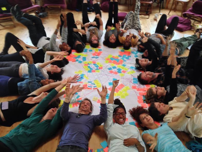 Activists at a Beautiful Trouble training that Rae co-organized, circle up around a pile of post-its after mapping movement allies and challenges - June 2015
