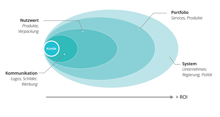 Das folgende Modell verdeutlicht das Potential, welches Design Unternehmen bietet in dem es den Einfluss von Design auf das Gesamtergebnis aufzeigt. Den Kunden im Zentrum bilden visuelle aber auch haptische Elemente wie zum Beispiel die Verpackung die Basis. Servicedesign betrachtet das Portfolio gesamtheitlich und ist somit der Übergang zur Organisation. Betrachtet man die Gesamtorganisation birgt Design darüber hinaus großes Potential für die Gestaltung und Verbesserung interner Prozesse.