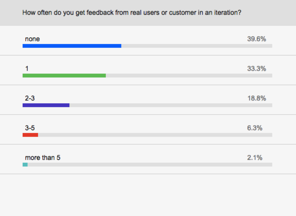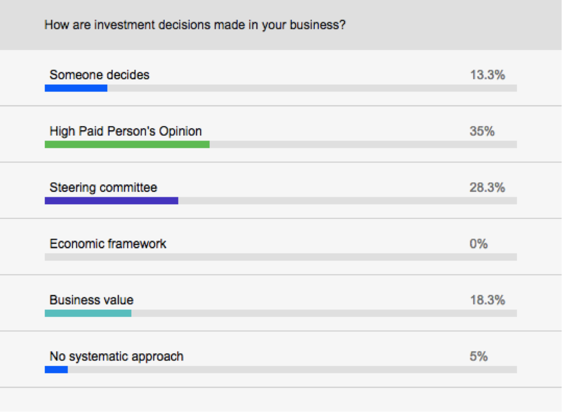 Throughout the course of the webinar I asked the attendees three questions to get a sense of what techniques they are currently using and how they are incorporating customer/user feedback, measurement and decision-making frameworks into their development process to drive success in their own organisations. As ever, the results are both interesting and surprising.