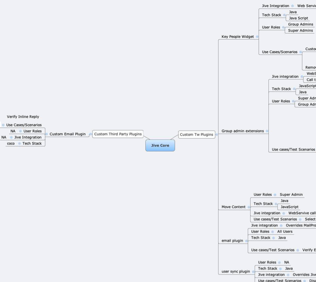 We decided upon creating a Mind Map to visualize the different user flows that in turn could depict the automation scope and paths that can be covered in the test scenarios. Understanding the tech stack for each and every plugin and their integration points with Jive was required for us to shortlist potential test automation tools.