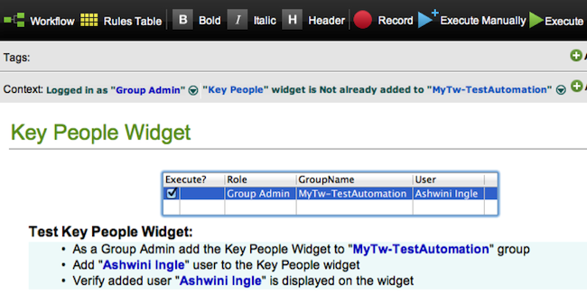 Since our codebase is all in Java and we might need to interact with the plugin APIs directly whenever needed, we thought of keeping the tech stack same. The first choice that popped up for BDT in Java was Twist. I went through the Twist help documentation and then started to spike out a simple use case, or “scenario” as Twist calls it, on the myThoughtworks portal. I chose to automate a common user flow – Login, visit a group, drag-drop a widget, save the changes and logout. The Mind Map that I had created was of great help here; as I had the test inputs, test data, user roles and test workflow handy. Setting up Twist and creating this first scenario was quick and easy.
