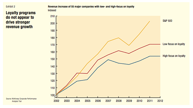 The McKinsey Consulting study ‘Making Loyalty Pay: Lessons from the Innovators’ [pdf] blew up the idea that the existing loyalty programs pay royal dividends for retailers.  Over a period of 10 years, loyalty-focused companies grew at much lesser rate, as compared to companies which were less focused on loyalty.