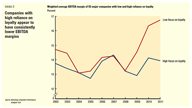 Moreover, if you thought loyalty brings in more profit, you are in for a surprise. Over the same ten-year-period loyalty-focused companies had EBITDA margins considerably lower than the companies who were less focused on loyalty programs.