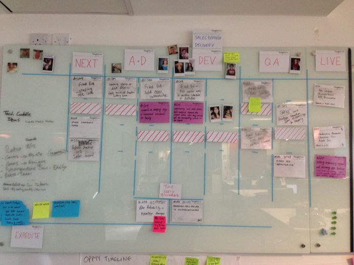 Expedite - The expedite column helped us work on priority feature requests or critical bugs. Each story takes some time to go through all the lanes before the story releases. Sometimes, a critical bug or feature request came through which took priority. Hence the bug/feature was critically analysed by the entire team before categorising it as a potential candidate for expedition. The team had to drop all other tasks and work on this story. At one time, only one story was allowed in that column. If all stories were expedited then the stories on the wall would be ignored for a long time.