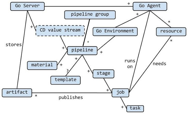 Briefly, a pipeline may be based off a template. Materials refer to source code repositories or other pipelines. A pipeline group is a grouping of pipelines for administrative convinience. It is useful to think of a directed graph of pipelines (say from build to functional-test to integration to performance to QA to UAT to staging to production) as your continuous delivery value stream. An environment represents a ring-fencing of agents and includes one or more pipelines. The unit of work is a job. Jobs may be tagged with required resources so that they run only on correspondingly tagged agents. Jobs can be made to publish artifacts that are then stored on the server.