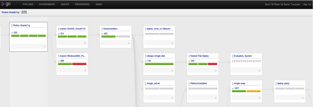 The map above shows the key pipelines involved in the flow from our tests using Firefox and Oracle 11g all the way through to testing our hosting environment. Once the ‘mingle-saas’ pipeline is green I know that the targeted bug fix will be ready for deployment to our dogfooding environment (called ‘pasty’).