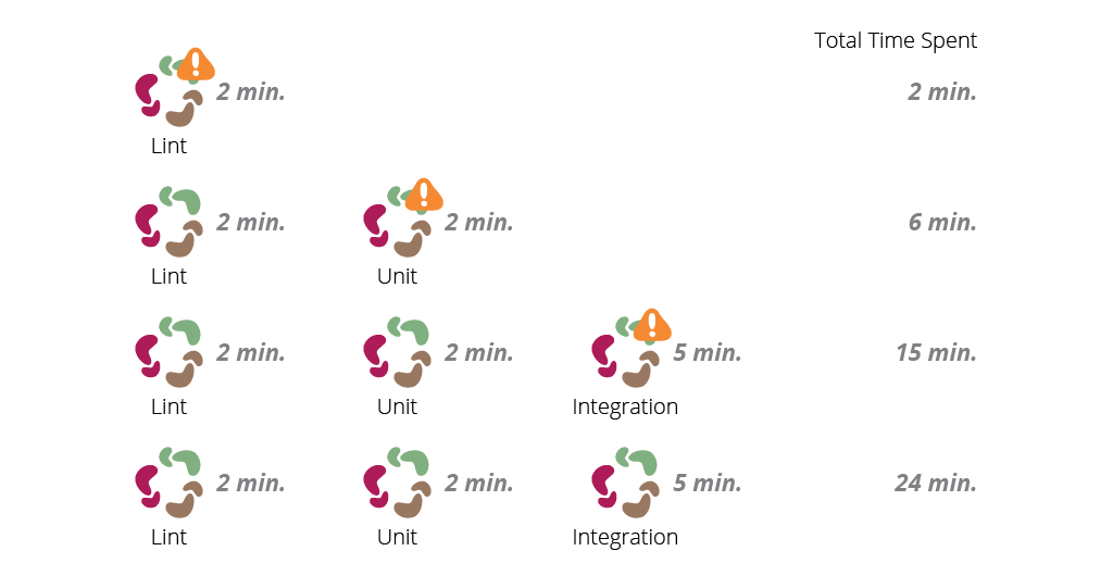 Running tasks in parallel is also a great idea to reduce the feedback cycle. For example, let's say that as part of your pipeline you have code lint (which takes 2 minutes), unit tests (another 2 minutes) and integration tests (which take a little longer, 5 minutes). Considering the worst case scenario, where a commit breaks all three jobs, it would take 24 minutes just to get a green build in the sequential pipeline.