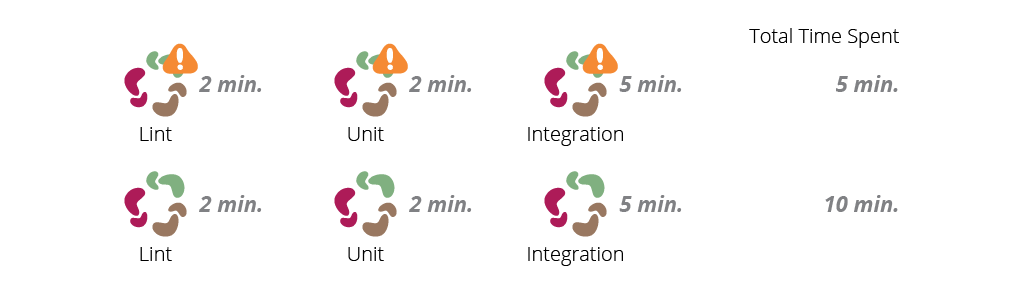 Now, if we setup our tasks to run in parallel, and if a code breaks each job, it would only take five minutes for your team to get feedback and another five to get a green build.