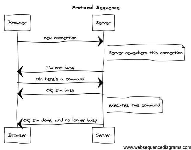 When the server receives an open from a browser, it remembers that browser connection. When a message is received by our server, it asks the debugger to execute the command if it is not already busy.