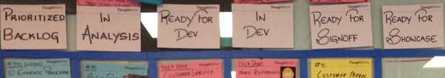 To solve this I shifted from testing and signing off stories to creating a team culture that is responsible for the quality of the software. I started advocating quality in many aspects of the project but none of them were as disruptive and effective as removing the QA column as seen in the picture.
