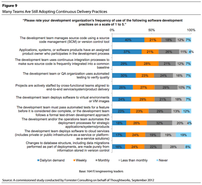 Finally, some numbers on adoption. Last year we collaborated with Forrester on researching continuous delivery in enterprises. It’s a great study that reveals the maturity of enterprises implementing CD and the drivers behind it, and provides a maturity model for people wanting to implement it. But the research reveals that, as an industry, we have some way to go in adopting the practices: