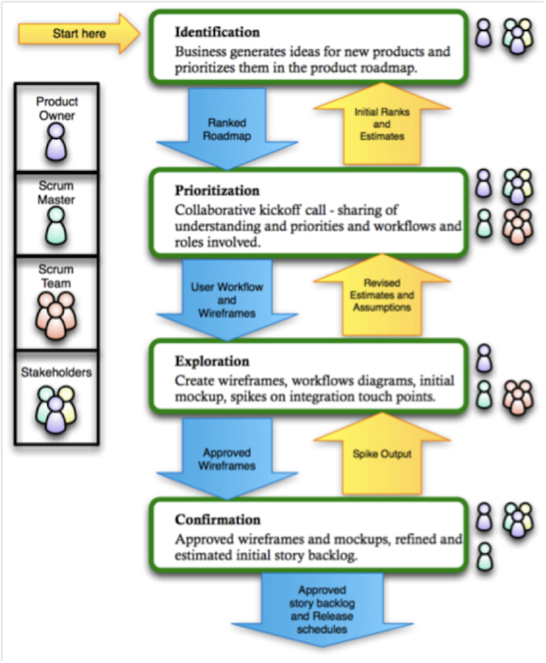 At the client company, all of these (re)prioritization activities are incorporated as part of the regular sprint work, so that the entire project team has more visibility into the potential pipeline of work and can provide quick feedback to the product owners on the ‘current’ state of the backlog and team capacity. Also first draft of user workflows and wireframes are created to aid in estimation.