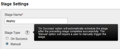 Simply creating a downstream deployment pipeline won’t do the trick. For one, it would auto-schedule for every successful upstream build thus wiping out the previous deployment and any testing in progress. To prevent auto-scheduling, you need to mark the first stage of the downstream pipeline as type manual.