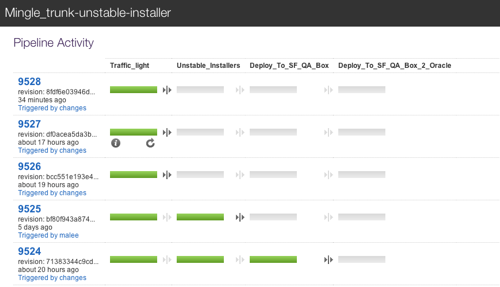 Fast feedback: Our main motive is not only getting a build out exhaustively tested with automation in place, but also to get faster feedback to the developers. Go helps us deploy“unstable” installers (created from code that is freshly checked in) on to our QA machines by a single click. This saves our testers time and allows them to do more exploratory testing on features, while giving instant feedback. This helps us to fail fast and improvise. The screen below shows every checkin available to generate installers and also the ability to do a literal push-button deployment to our QA boxes.