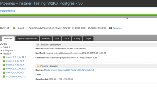 Support for exhaustive automated test builds: With the help of Go we run our upgrade tests. As Mingle has to be installed, a product major challenge is to support upgrades from our older releases. This means we are supposed to test more than 4 releases for upgrade which can be time consuming (around 2 wks). With Go, we have automated this for 3 OS and 3 database flavors. These tests are run on every single build that goes green across all platforms and databases we support, and take only take a couple of hours to run. Below is an example: