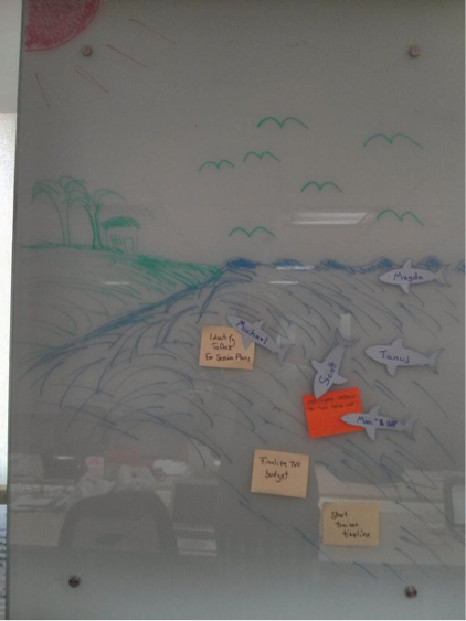 Shark tank came in as runner up. We liked it for its inventiveness and creativity, both unique to the team who ideated it. It also excels at focusing attention on work in progress and who’s doing it. It also speaks to the team’s simple three-stage workflow (to doing, doing, and done), two stages of which they visualize on the wall: work in progress (to be eaten away) and work soon to be available to those chomping jaws. Read more about shark tank’s story.