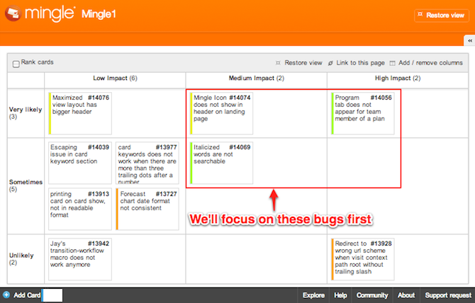 Every two weeks we revisit our bugs to make sure we’re working on the most important defects in our product. We arrange our bugs on a matrix where impact is along the horizontal axis and is quantified as Low, Medium or High. Likelihood of occurrence is arranged on the vertical axis as Unlikely, Sometimes or Very Likely. Once we reach agreement on the general impact and likelihood of each bug we end up with a matrix where the bugs we want to fix first are generally in the upper right area of the matrix and the bugs we may defer or simply not fix are located in the lower left area.