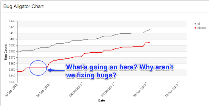 Since bugs are, in part, a reflection of the quality of our product we know that we shouldn’t ignore them. Above I mentioned that every two weeks we triage our bugs. What I should have said is, we intend to triage our bugs at the start of every iteration (2 weeks for us), but we sometimes fall short. Conflicting schedules and priorities sometimes cause us to miss these meetings. When that happens it’s nice to have a reminder that we’re being delinquent. Enter the bug alligator chart: