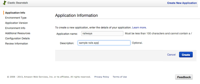 In order to start using Snap for AWS deployments, we first need to setup an Elastic Beanstalk application and environment from the AWS console as shown in the figures below: