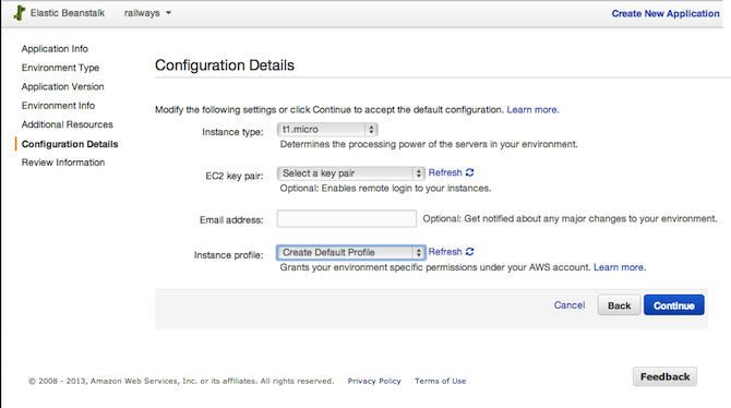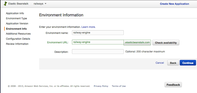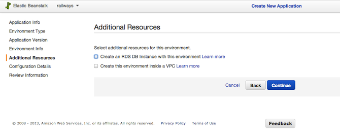 Note that if your application uses RDS you will have to create a RDS instance when creating your environment. You can view the steps for creating the RDS instance here. If you are using any other databases please ensure that you have them installed and configured on the environments you are deploying to.