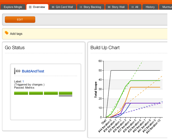 Using OpenSocial gadgets, you can track the progress of your Go build-test-release pipeline and see the status of your builds from your Mingle project itself.