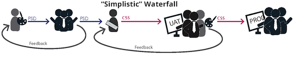 As designers never speak to developers prior to User Acceptance Testing (UAT), they have one shot at communicating via documents. This means time lost writing, refining and digesting books of documentation. Post that, as developers moves PSDs into visual assets, more translation time-consumers emerge - typefaces not suitable for web, non-normal blending in gradients, specific image treatments, inconsistent colors due to color-pickers. As do “short-cuts”, like image-sprites cut from PSDs to save developers the hassle of fully translating PSD into a Cascaded Style Sheet (CSS), which leads to technical debt and future problems (think retina screens.. and beyond retina).