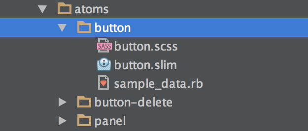 Boom! Our button.slim and _button.scss along with the sample-data (for the style-guide) all reside alongside one another. It’s now easy to understand what styles are applied, we’re secure and safe in our refactoring of the button if we need and it’s easier and less error-prone for front-end developers reusing in this way. Now we’re talking!