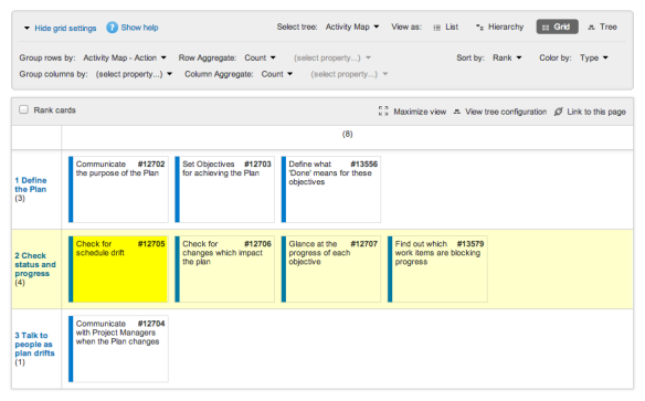 Intentionally simple, activity maps may be re-purposed easily in digital and physical form. In Thoughtworks’ Mingle, activity maps can be set up in a matter of minutes. With added power from Mingle’s query language “MQL” you can easily track the progress of individual user stories in the context of their corresponding operations.