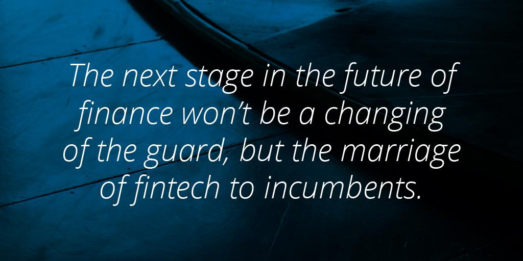 The next stage in the future of finance won’t be a changing of the guard, but the marriage of fintech to incumbents. Fintech innovators and established players are finding it more advantageous in working together than in competing against each other.