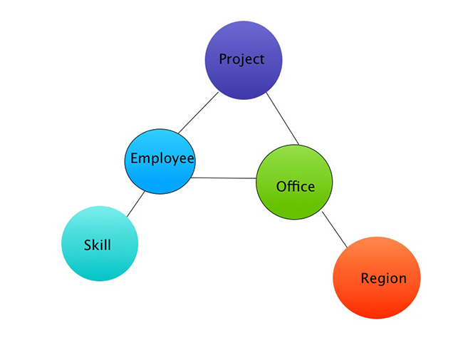A: This was a perfect opportunity to use graph databases. Neo4j was a good fit for this problem. Analyzing region, offices, employee, skills and travel information and projects relationship was such fun and geeky work. Here is simple query that gives me all the skills based of a region.