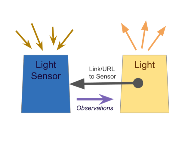 The light depends on the light level sensor. That's the simple, powerful interaction and programming model that CoAP allows us to use - if we allow Things themselves to be the observing client. The state of a Thing depends on the states of the other Things that it links to. You can also have other abstract, non-real Things interacting in the peer mesh, which we can still call Objects.