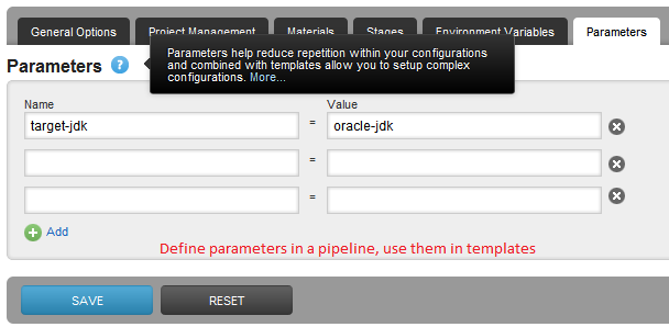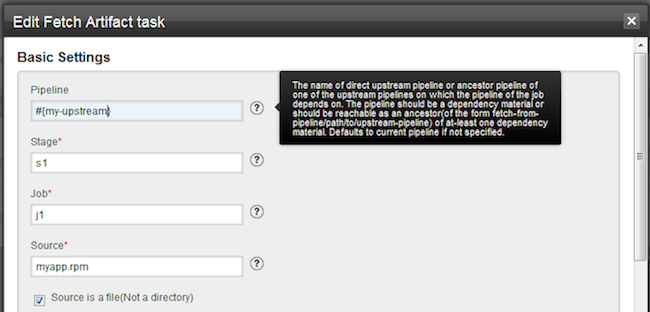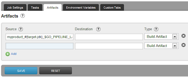 Then, in the template, at the appropriate job, specify the name of the artifact as: myproduct_#{target-jdk}_$GO_PIPELINE_LABEL