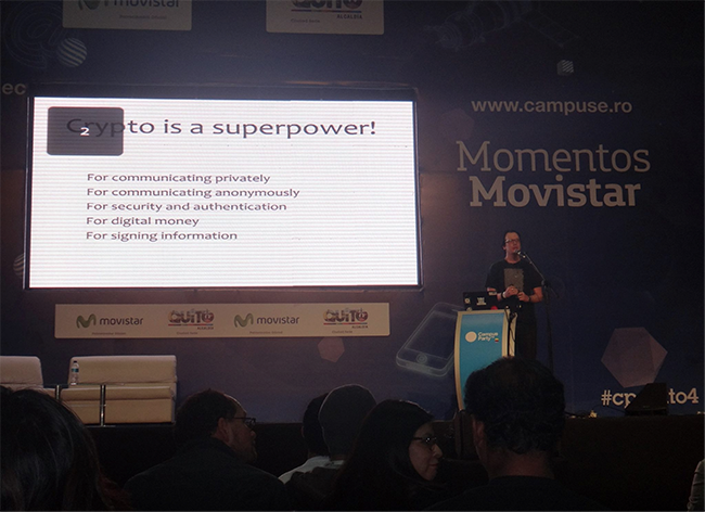 Llevado a cabo en el margen de los tres días del Campus Party, el cual atrajo a más de 3,000 estudiantes y numerosos profesionales del Ecuador, EnQripta Quito fue el espacio donde expertos, periodistas y amantes de la tecnología, compartieron sus criterios de por qué la privacidad en línea es importante y como la encriptación nos permite lograr dicha privacidad en nuestras comunicaciones diarias.
