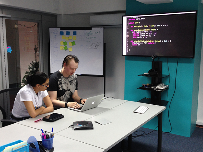 Después de unos pocos ejemplos la audiencia se dividió en dos grupos y los dojos comenzaron. Ambos grupos tuvieron sendas sesiones de dos horas en Scala antes de reunirse para revisar los avances y moverse al siguiente lenguaje.