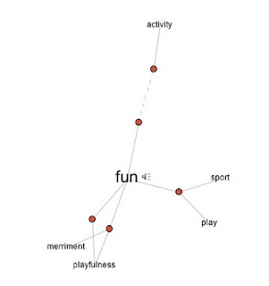In 1905, Freud wrote an extremely long and tedious book entitled Der Witz which can completely spoil jokes for you for the rest of your life, if you read it. So I hesitate to delve too deeply into the true nature of fun, but this is for a good cause. There's a super cool web site called Visual Thesaurus which actually visualizes synonyms for you in a little map. Here's what VT does with "fun:"