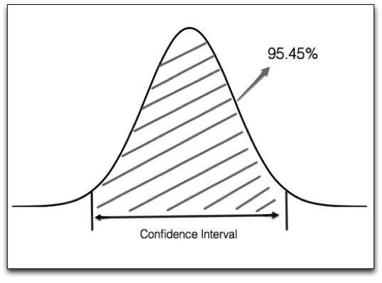See the shadowed part of the image above? 95.45% of the possibilities fall into an interval, which statisticians call the Confidence Interval. For our example, we can get the confidence interval for each group using a standard formula.