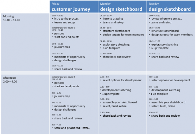 Pre-planning the teams is also a good idea in order to ensure a good mix of disciplines. A sample 3-day workshop agenda is shown below.